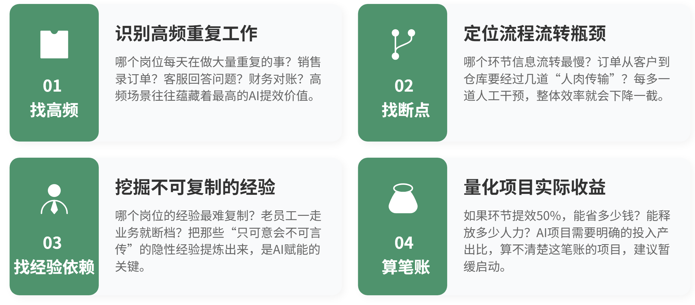 这个环节能节省多少时间?能省多少钱?能释放多少人力?能长出什么与竞争对手不一样的能力?算不清楚账的AI项目,别上。