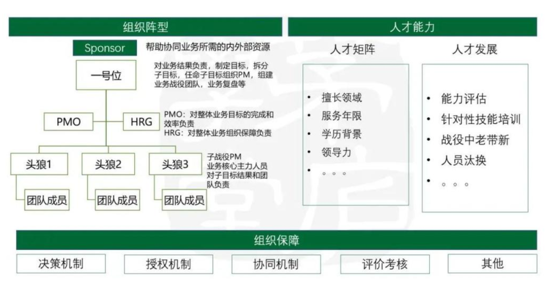 ■ 战役的HRG:与PMO一起打配合的,对整个战役组织保障负责。跟业务leader一起,关注排兵布阵是否合理;战役中关注团队行为和状态,及时配合进行员工培训、士气调动、文化渗透;通过绩效目标的设定进行过程和结果的激励,战役后参与结果的评估;同时HRG也要关注到一号位的能力提升,有需要的时候及时帮一号位“照镜子”和进行补位。