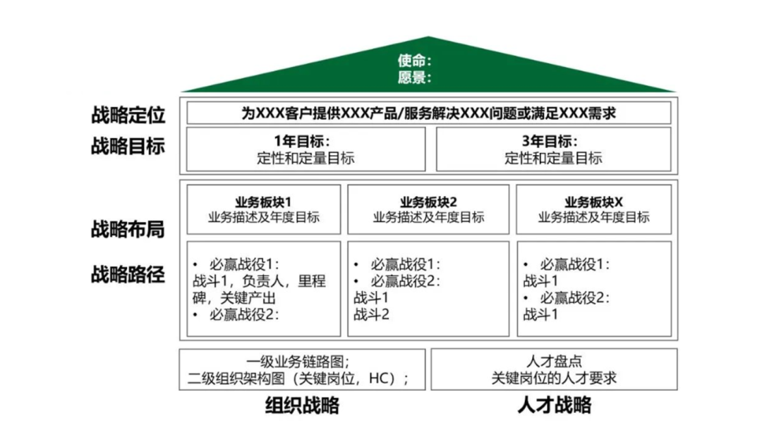 至此,业务战略清晰了,就可以来盘一盘企业的业务链路是否顺畅,现有的组织架构是否能够支撑战略落地,是否需要调优,其中的决策机制、激励机制、协同机制是否需要优化,再来盘一盘每个部门的职责定位是否清晰,关键岗位所需的胜任力,再对照现有组织的人才盘点,看看人岗是否匹配,最终可以梳理出能够支撑企业业务战略落地的组织和人才战略。 企业从使命愿景出发,借助战略飞轮和战略屋,可以更清晰的看清楚自己的战略定位和战略实施路径,可以借此共创的过程,让团队达成共识,更清晰落地路径,可以真正凝聚一群志同道合的人一起朝着同一个目标前进。